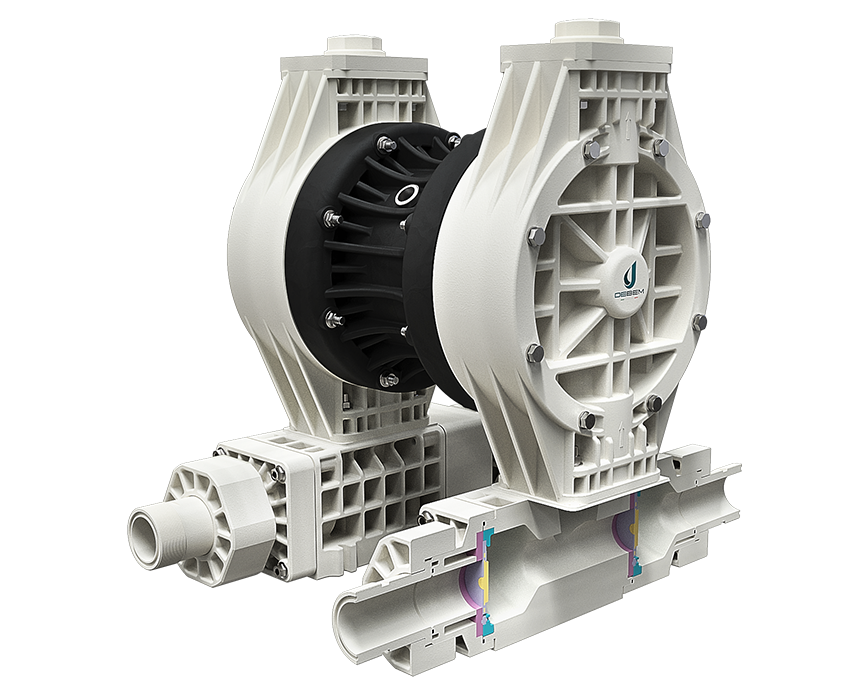 Die Druckluftmembranpumpen zeichnen sich vor allem durch ihre Robustheit und Leistung, ihren Einsatz als selbstansaugende Pumpe (trockene Anordnung am Boden und pumpen aus negativer Saughöhe) auch im Rahmen von Schwerlastanwendungen und zum Transfer von hochviskosen Fördermengen mit möglichen schwebenden Feststoffanteilen aus. Die Serien BOXER und CUBIC sind beide mit einem speziellen Koaxial-Drucklufttauscher an der Welle und ohne irgendwelche Außenkomponenten ausgestattet. Dabei handelt es sich um ein einzigartiges Teil, das besonders widerstandsfähig gegenüber der Eisbildung ist und trotzdem bei keiner anderen im Handel erhältlichen Pumpe zu finden ist. Alle Druckluftmembranpumpen dieser beiden Serien wurden speziell getestet, um die maximale Sicherheit in schwierigen Umgebungen (d. h. im Falle des Vorhandenseins von besonders aggressiven und hochviskosen Fördermedien) zu garantieren. Sie können ohne Beschädigung der Pumpe trockenlaufen, bedürfen keiner geschmierten Luft und sind selbstansaugend. Darüber hinaus sind ihre Komponenten einfach auszutauschen und die Wartung kann auch problemlos durch gering qualifiziertes Personal erfolgen. Es sind Ausführungen in POLYPROPYLEN, PVDF / ECTFE, Aluminium und Edelstahl AISI 316 L erhältlich.