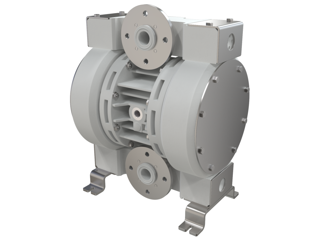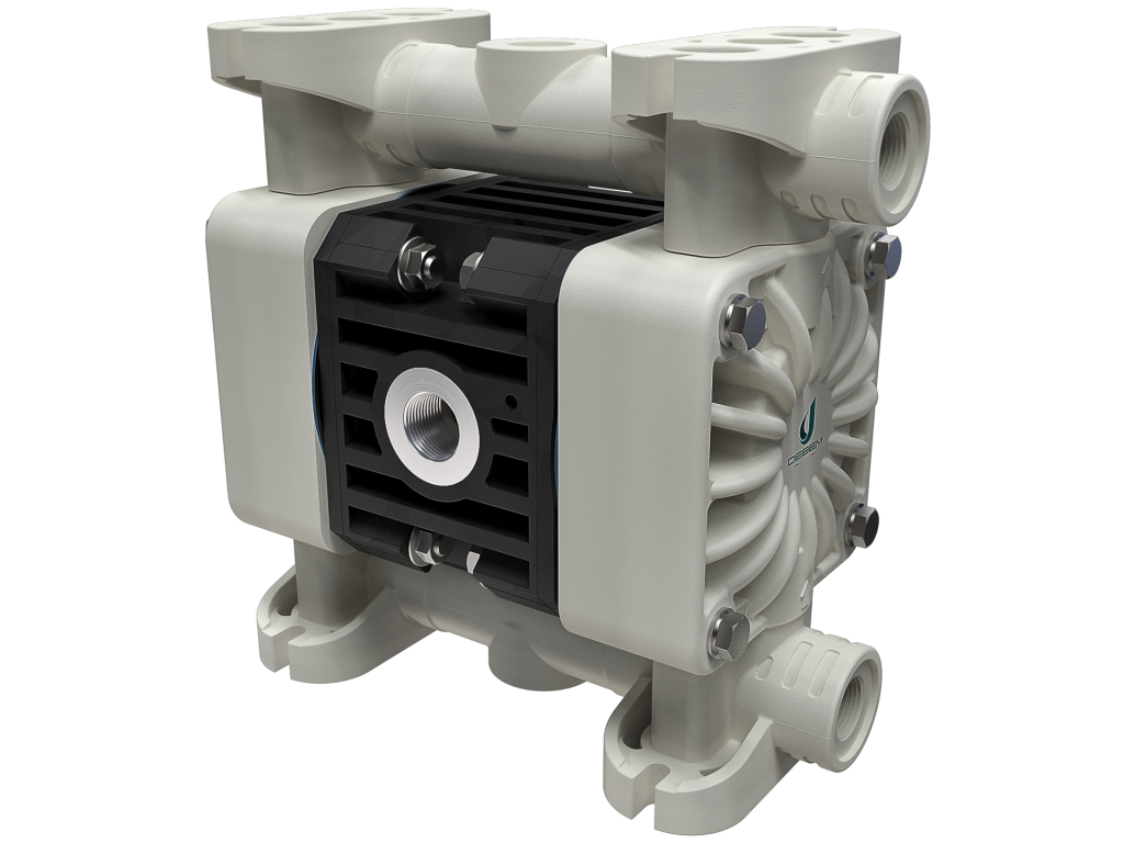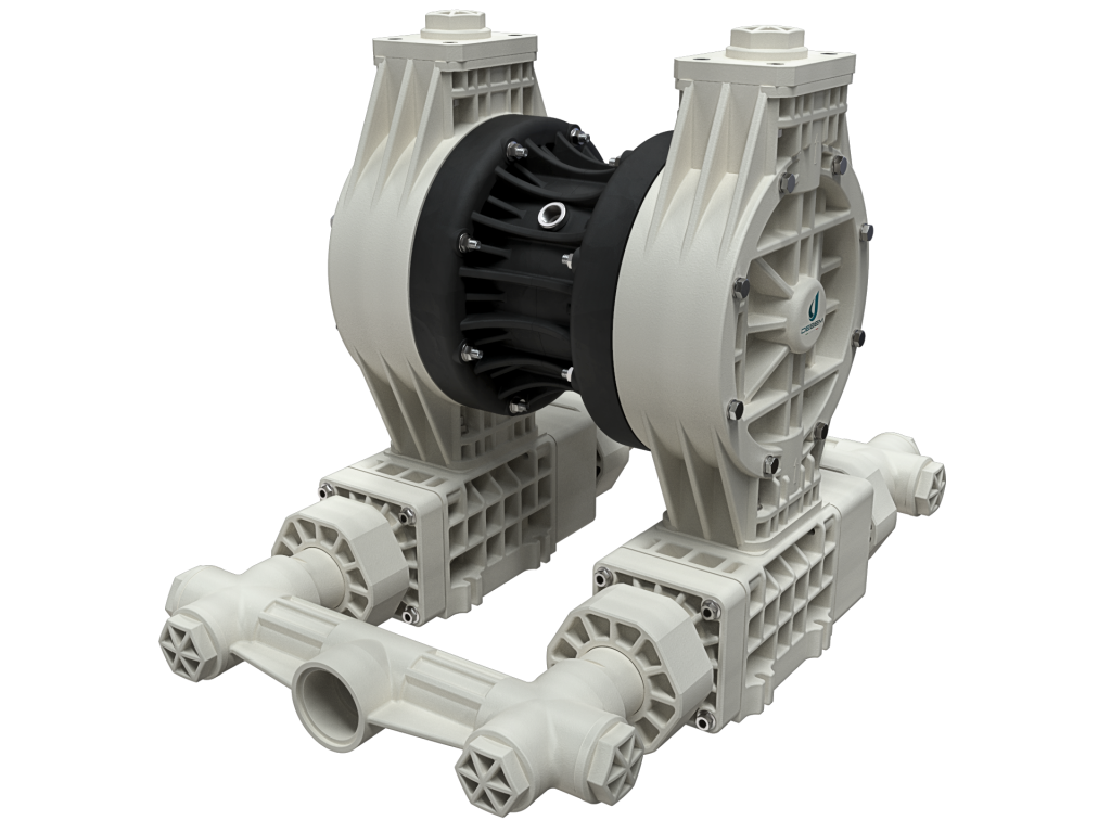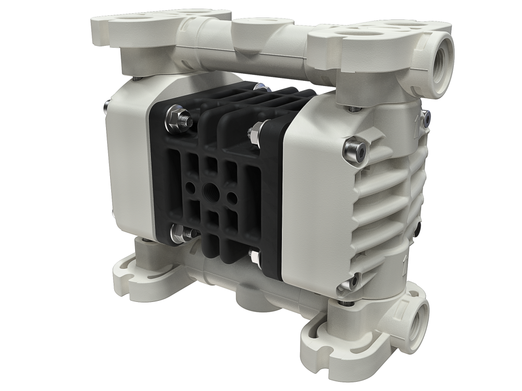 Bomba neumática de nuevo diseño, fabricada completamente con PTFE FDA macizo, para las partes en contacto con el fluido, que se usa sobre todo en la industria química, por su alta resistencia a los productos ácidos agresivos, y en la industria alimentaria.