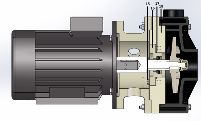 8b) Dans le cas de pompes MB 110/180 – TL, désaccoupler la bride porte-joint (16) de la bride arrière (18), en enlevant les vis de serrage (15) ; le joint torique d’étanchéité (17) devra être enlevé en même temps.