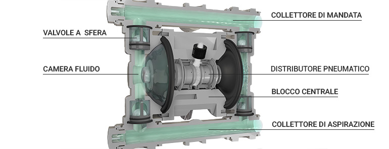 - I Collettori: offrono l’interfaccia di collegamento all’impianto e sono fissati alle camere esterne per garantire la tenuta e nello stesso tempo per creare un percorso di flusso del fluido. Talvolta includono l’alloggiamento delle sfere che ha funzionalità di valvola di non ritorno per impedire che il fluido aspirato ritorni al punto di partenza.