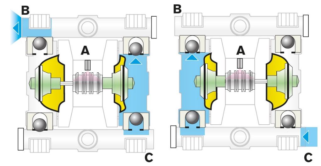 L’aria di alimentazione fluisce costantemente all’interno della pompa (ingresso A), innescando in questo modo il processo di pompaggio.